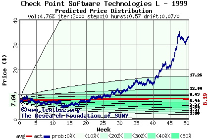 The high to date and low to date prices of the stock plotted against a random walk model for 1999 (what's this?).