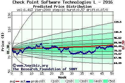 The following graph plots the year-to-date performance of the stock for 2016 compared to the probability calculated by a random walk model.