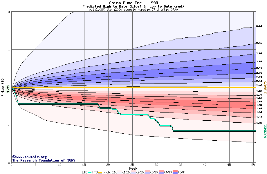The high to date and low to date prices of the stock plotted against a random walk model for 1998 (what's this?).