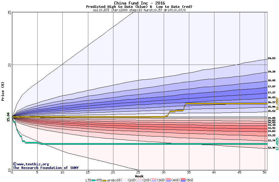 The high to date and low to date prices of the stock plotted against a random walk model for 2016 (what's this?).
