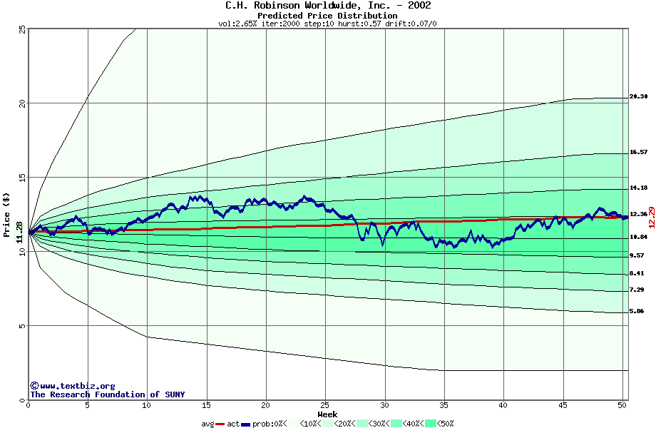 The following graph plots the year-to-date performance of the stock for 2002 compared to the probability calculated by a random walk model.