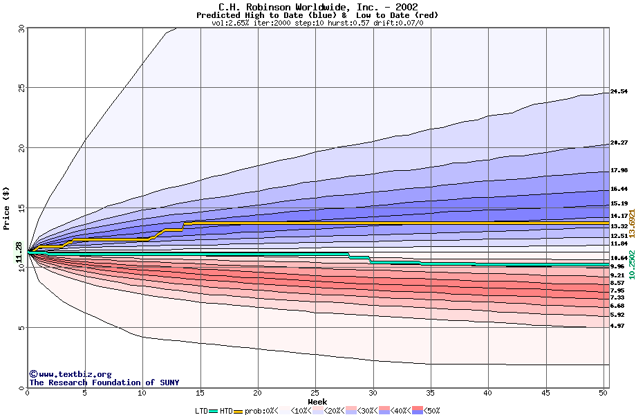 The high to date and low to date prices of the stock plotted against a random walk model for 2002 (what's this?).