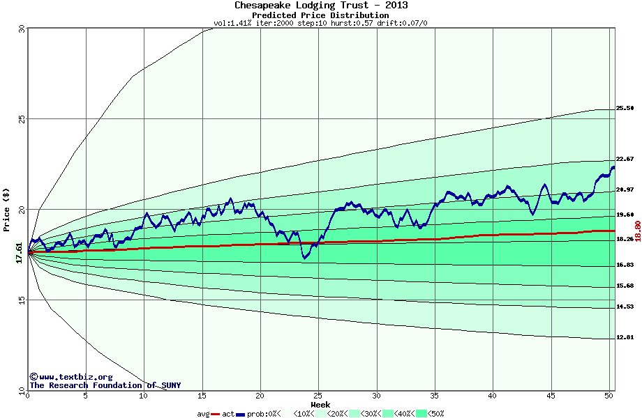 The following graph plots the year-to-date performance of the stock for 2013 compared to the probability calculated by a random walk model.