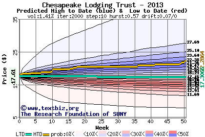 The high to date and low to date prices of the stock plotted against a random walk model for 2013 (what's this?).