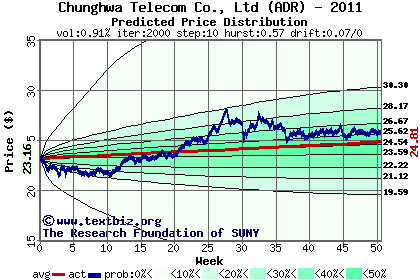 The high to date and low to date prices of the stock plotted against a random walk model for 2011 (what's this?).