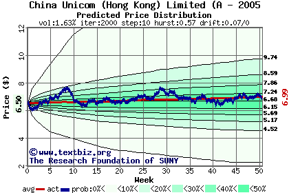 The high to date and low to date prices of the stock plotted against a random walk model for 2005 (what's this?).