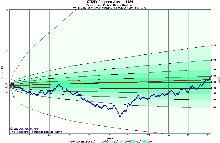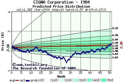 The following graph plots the year-to-date performance of the stock for 1984 compared to the probability calculated by a random walk model.