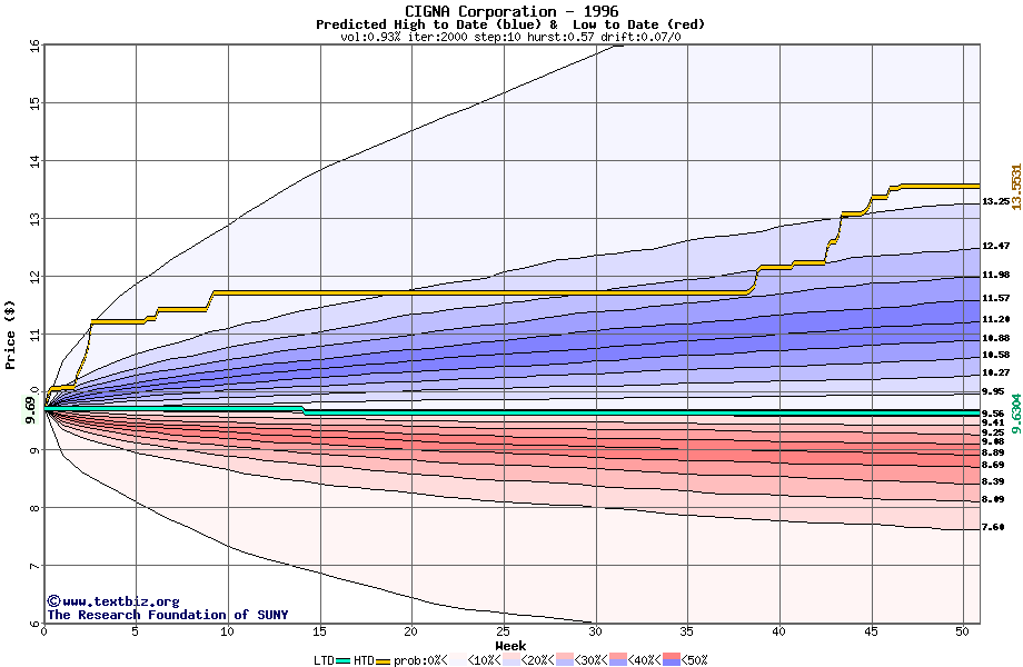 The following graph plots the year-to-date performance of the stock for 1996 compared to the probability calculated by a random walk model.