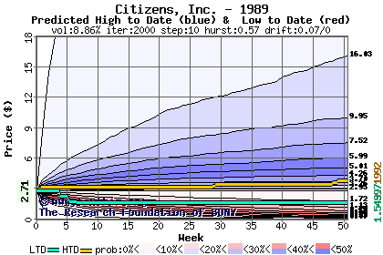 The high to date and low to date prices of the stock plotted against a random walk model for 1989 (what's this?).