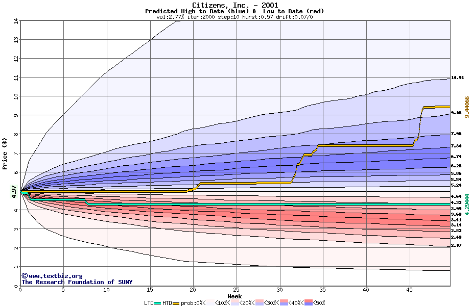The high to date and low to date prices of the stock plotted against a random walk model for 2001 (what's this?).