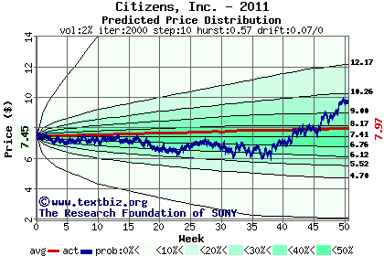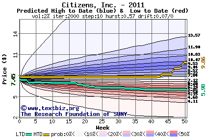 The high to date and low to date prices of the stock plotted against a random walk model for 2011 (what's this?).