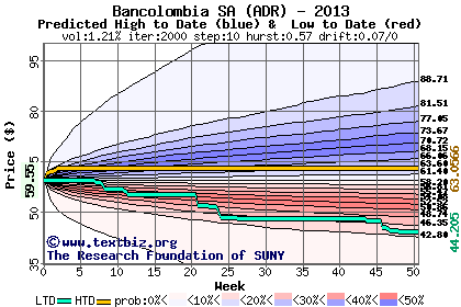 The high to date and low to date prices of the stock plotted against a random walk model for 2013 (what's this?).