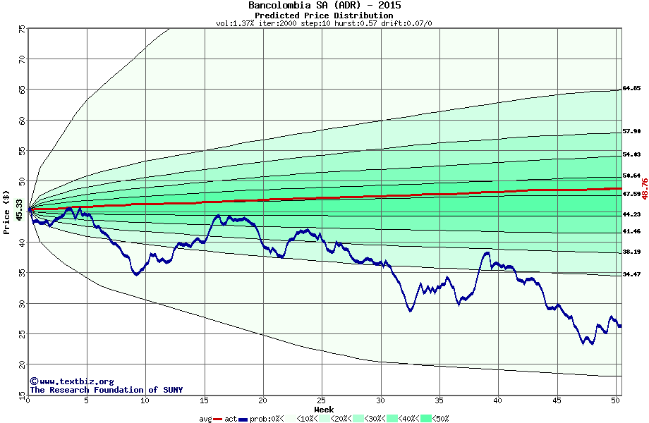 The following graph plots the year-to-date performance of the stock for 2015 compared to the probability calculated by a random walk model.