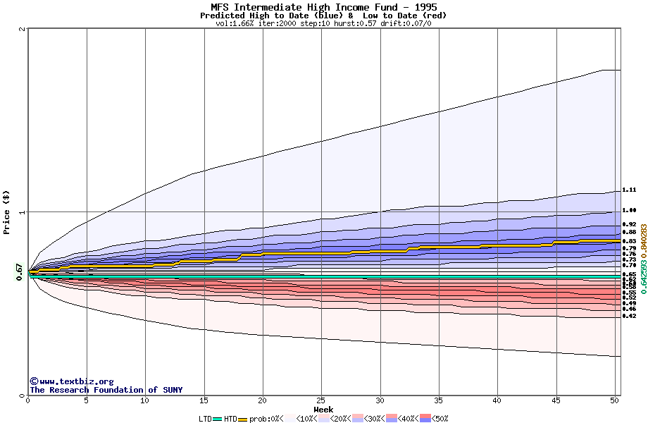 The high to date and low to date prices of the stock plotted against a random walk model for 1995 (what's this?).