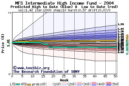 The high to date and low to date prices of the stock plotted against a random walk model for 2004 (what's this?).