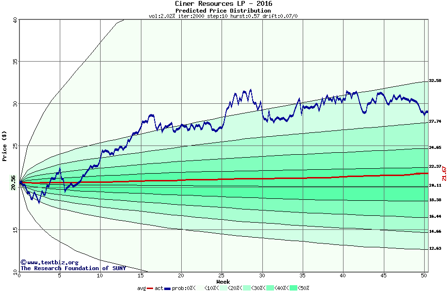 The following graph plots the year-to-date performance of the stock for 2016 compared to the probability calculated by a random walk model.