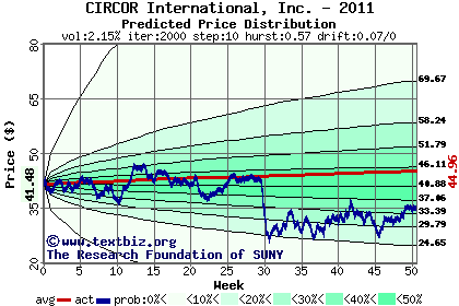 The high to date and low to date prices of the stock plotted against a random walk model for 2011 (what's this?).