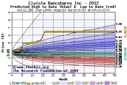 The high to date and low to date prices of the stock plotted against a random walk model for 2012 (what's this?).
