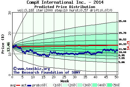 The high to date and low to date prices of the stock plotted against a random walk model for 2014 (what's this?).