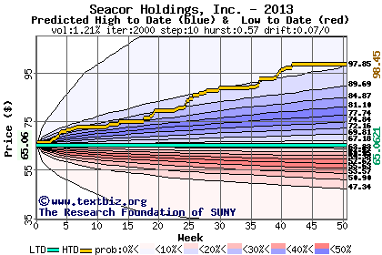 The high to date and low to date prices of the stock plotted against a random walk model for 2013 (what's this?).