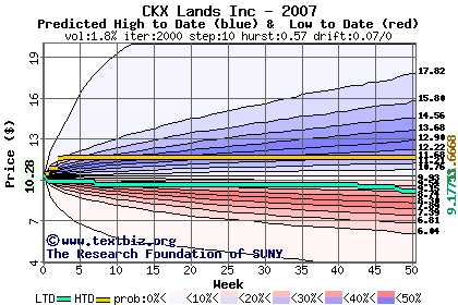 The high to date and low to date prices of the stock plotted against a random walk model for 2007 (what's this?).