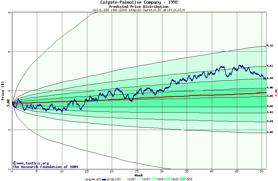 The following graph plots the year-to-date performance of the stock for 1992 compared to the probability calculated by a random walk model.