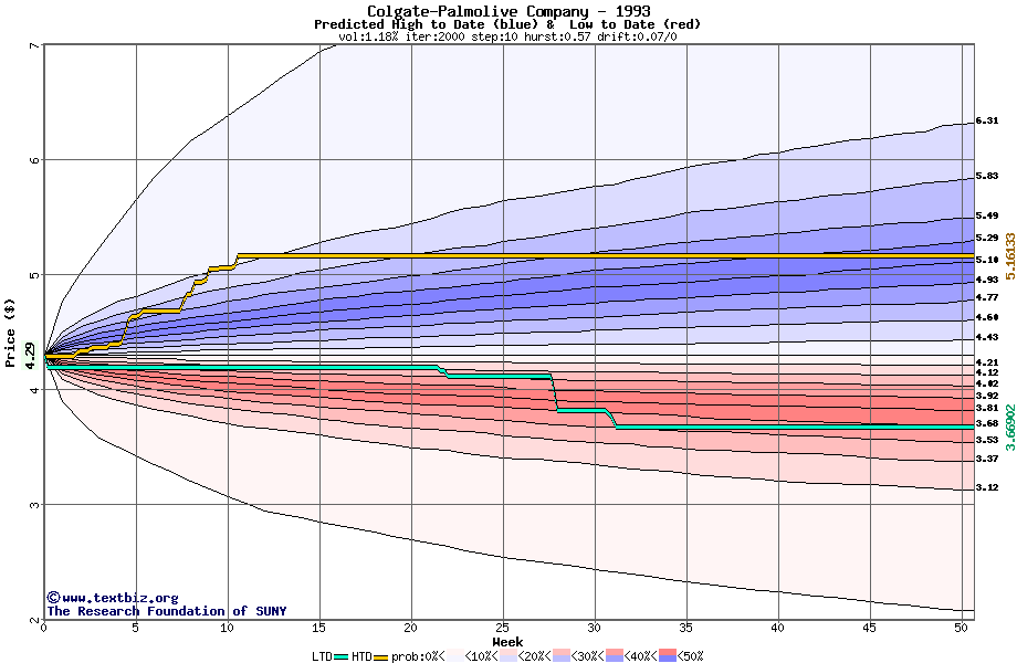 The high to date and low to date prices of the stock plotted against a random walk model for 1993 (what's this?).