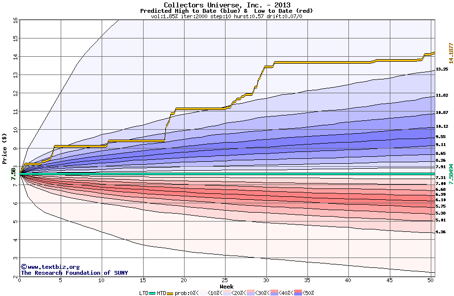 The high to date and low to date prices of the stock plotted against a random walk model for 2013 (what's this?).