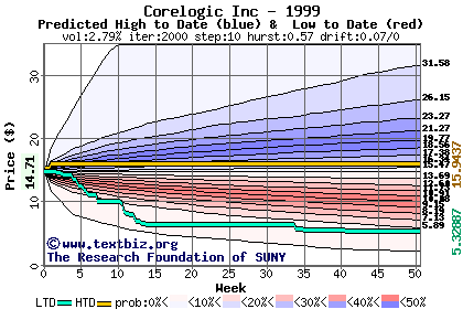 The high to date and low to date prices of the stock plotted against a random walk model for 1999 (what's this?).