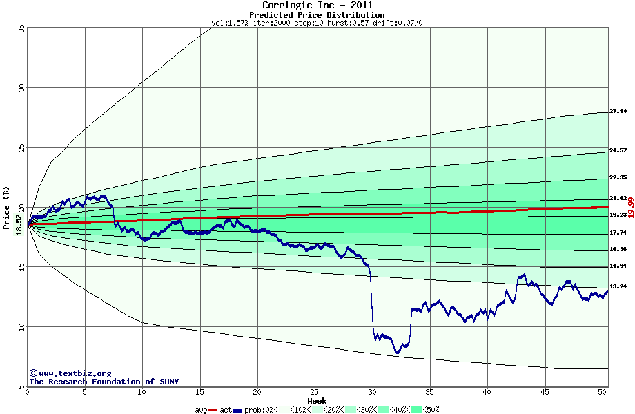 The following graph plots the year-to-date performance of the stock for 2011 compared to the probability calculated by a random walk model.