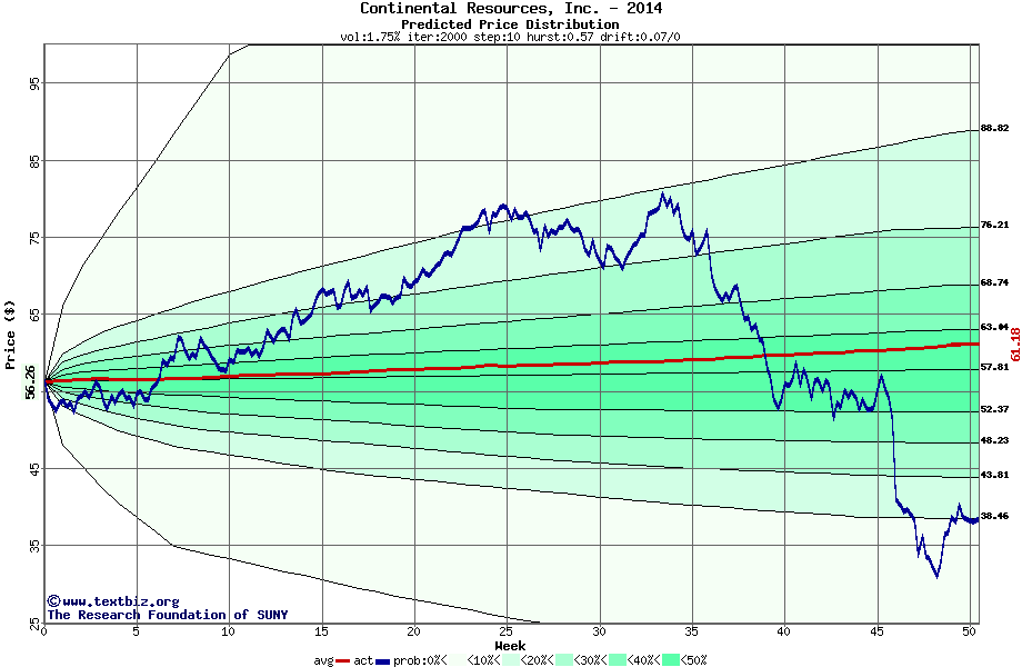 The following graph plots the year-to-date performance of the stock for 2014 compared to the probability calculated by a random walk model.