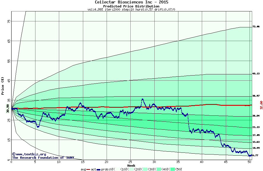 The following graph plots the year-to-date performance of the stock for 2015 compared to the probability calculated by a random walk model.