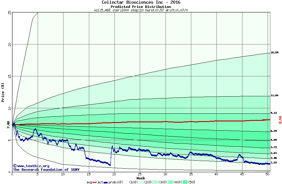 The following graph plots the year-to-date performance of the stock for 2016 compared to the probability calculated by a random walk model.
