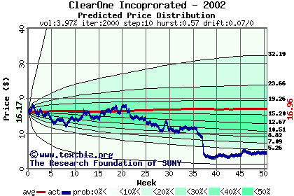 The high to date and low to date prices of the stock plotted against a random walk model for 2002 (what's this?).
