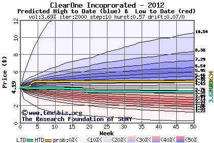 The high to date and low to date prices of the stock plotted against a random walk model for 2012 (what's this?).