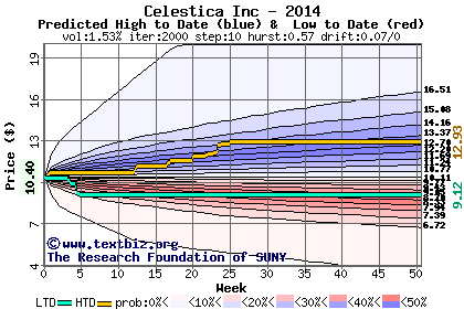 The high to date and low to date prices of the stock plotted against a random walk model for 2014 (what's this?).