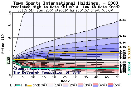 The high to date and low to date prices of the stock plotted against a random walk model for 2009 (what's this?).