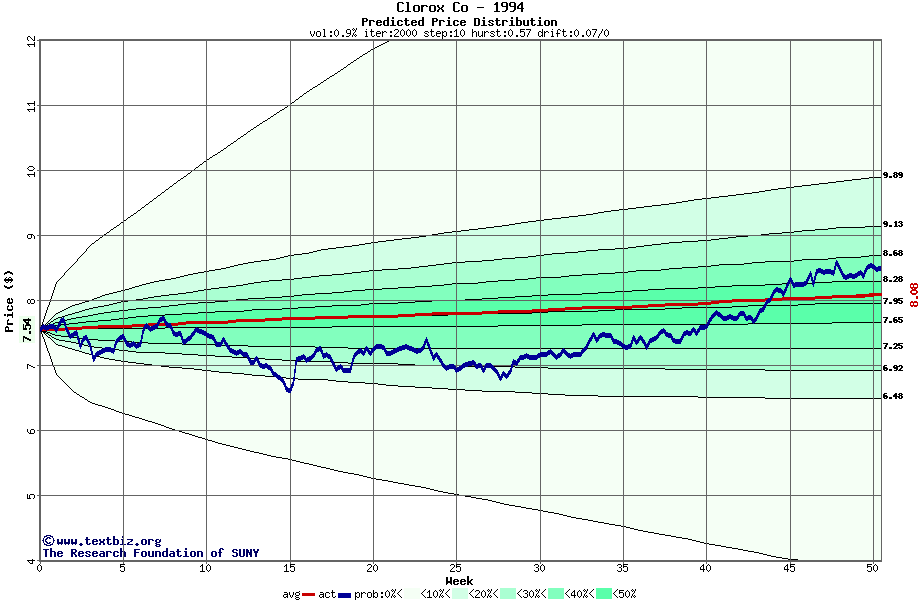 The following graph plots the year-to-date performance of the stock for 1994 compared to the probability calculated by a random walk model.