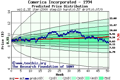 The high to date and low to date prices of the stock plotted against a random walk model for 1994 (what's this?).
