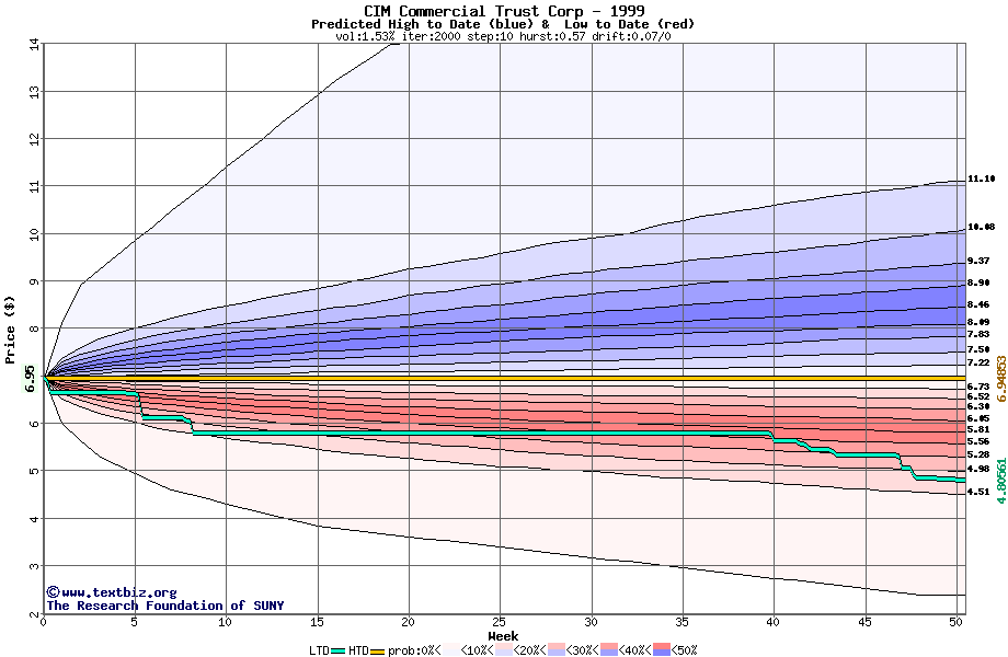 The high to date and low to date prices of the stock plotted against a random walk model for 1999 (what's this?).