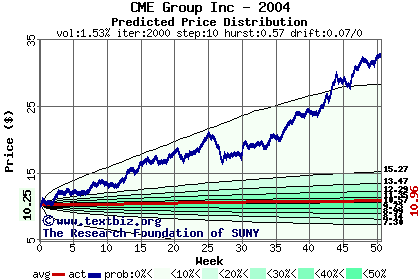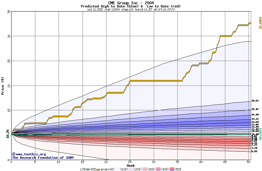 The high to date and low to date prices of the stock plotted against a random walk model for 2004 (what's this?).
