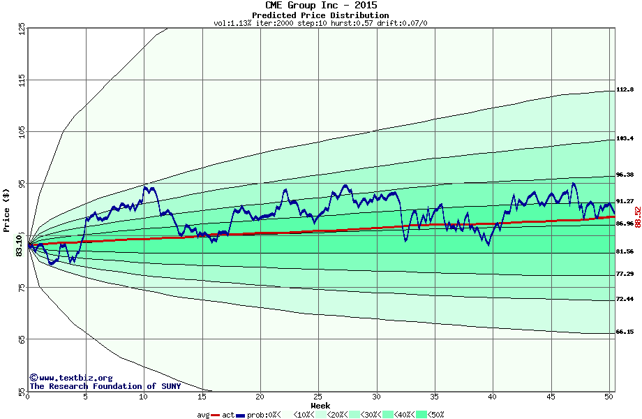 The following graph plots the year-to-date performance of the stock for 2015 compared to the probability calculated by a random walk model.