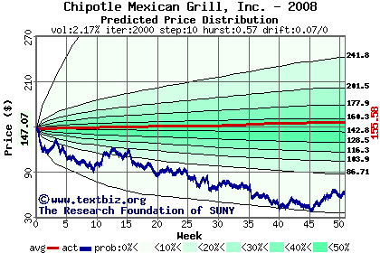 The high to date and low to date prices of the stock plotted against a random walk model for 2008 (what's this?).
