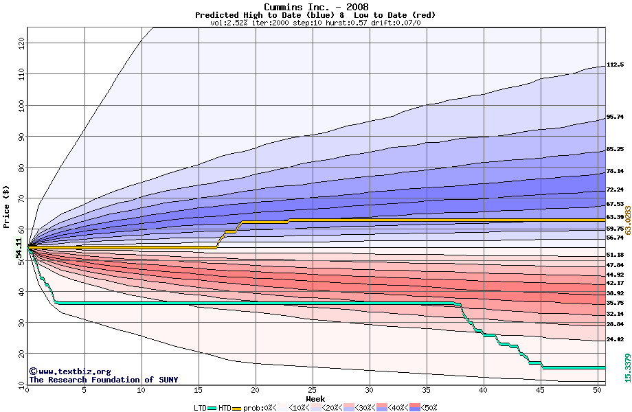 The high to date and low to date prices of the stock plotted against a random walk model for 2008 (what's this?).