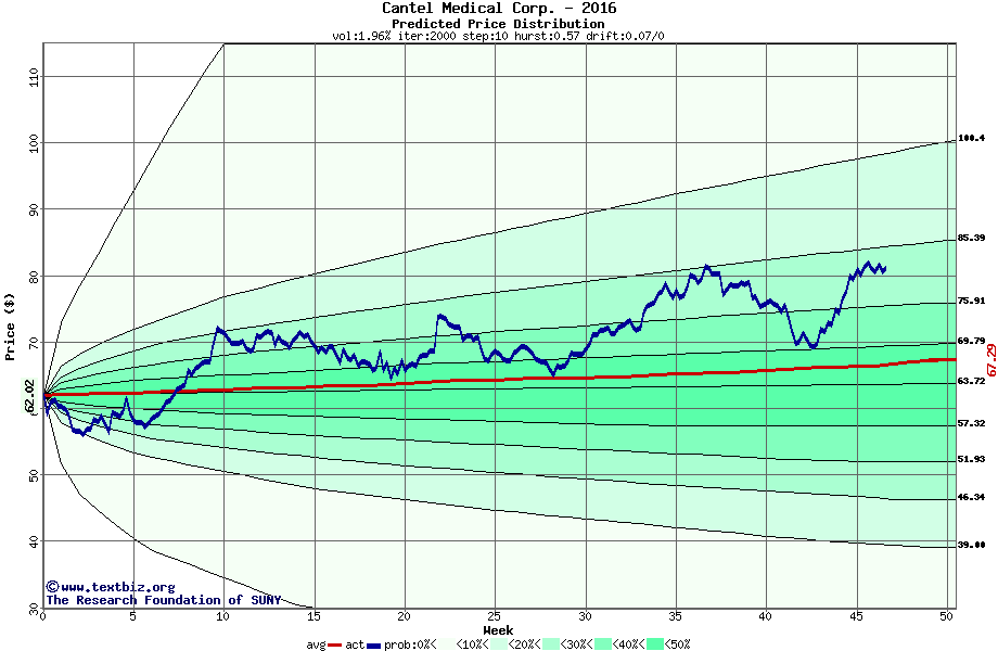 The following graph plots the year-to-date performance of the stock for 2016 compared to the probability calculated by a random walk model.