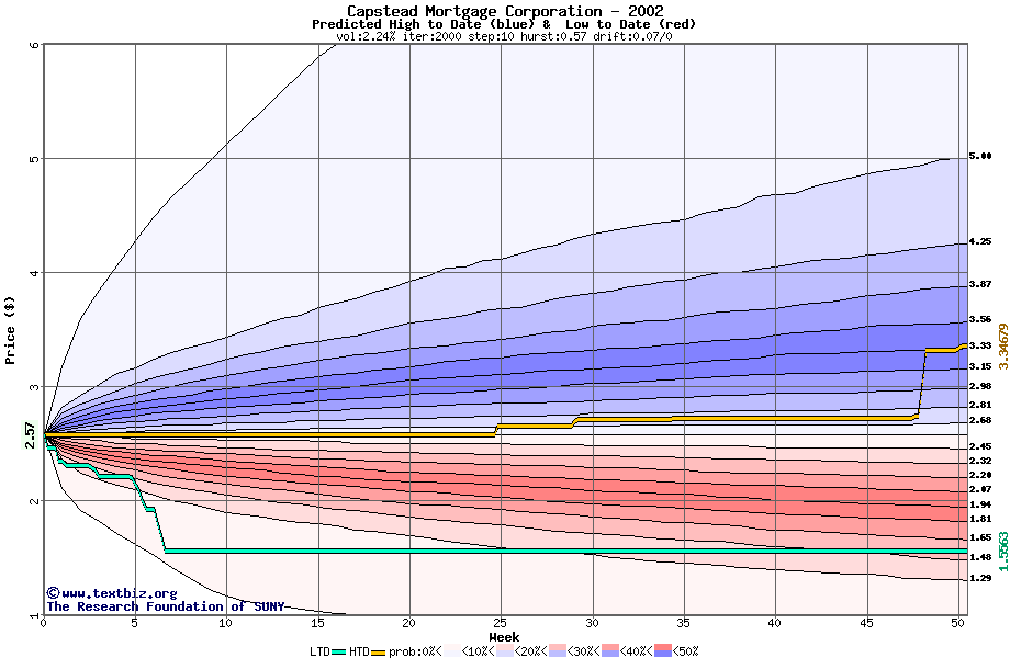 The high to date and low to date prices of the stock plotted against a random walk model for 2002 (what's this?).