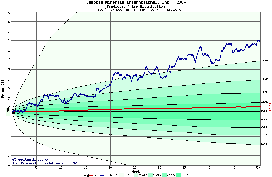 The following graph plots the year-to-date performance of the stock for 2004 compared to the probability calculated by a random walk model.