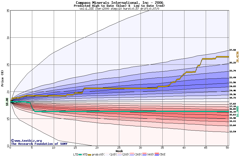 The high to date and low to date prices of the stock plotted against a random walk model for 2006 (what's this?).