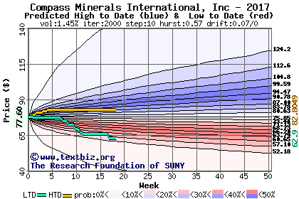 The high to date and low to date prices of the stock plotted against a random walk model for 2017 (what's this?).