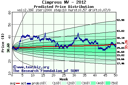 The following graph plots the year-to-date performance of the stock for 2012 compared to the probability calculated by a random walk model.